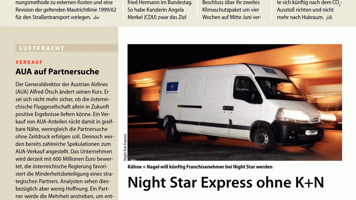 Luftfracht Night Star Express ohne K+N Der Logistikdienstleister Kühne + Nagel steigt als Gesellschafter bei Night Star Express aus, bleibt aber Franchisenehmer des Nachtexpress-Verbunds. Unna...