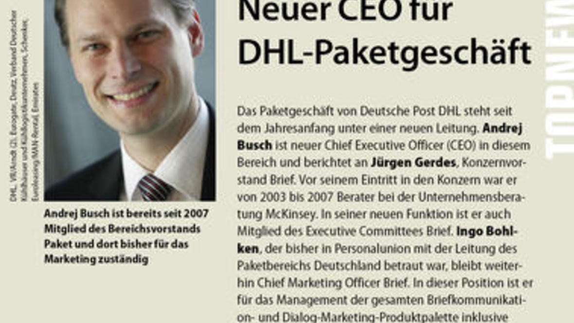 Neuer CEO für DHL-Paketgeschäft Das Paketgeschäft von Deutsche Post DHL steht seit dem Jahresanfang unter einer neuen Leitung. Andrej Busch ist neuer Chief Executive Officer (CEO) in diesem Bereich u...