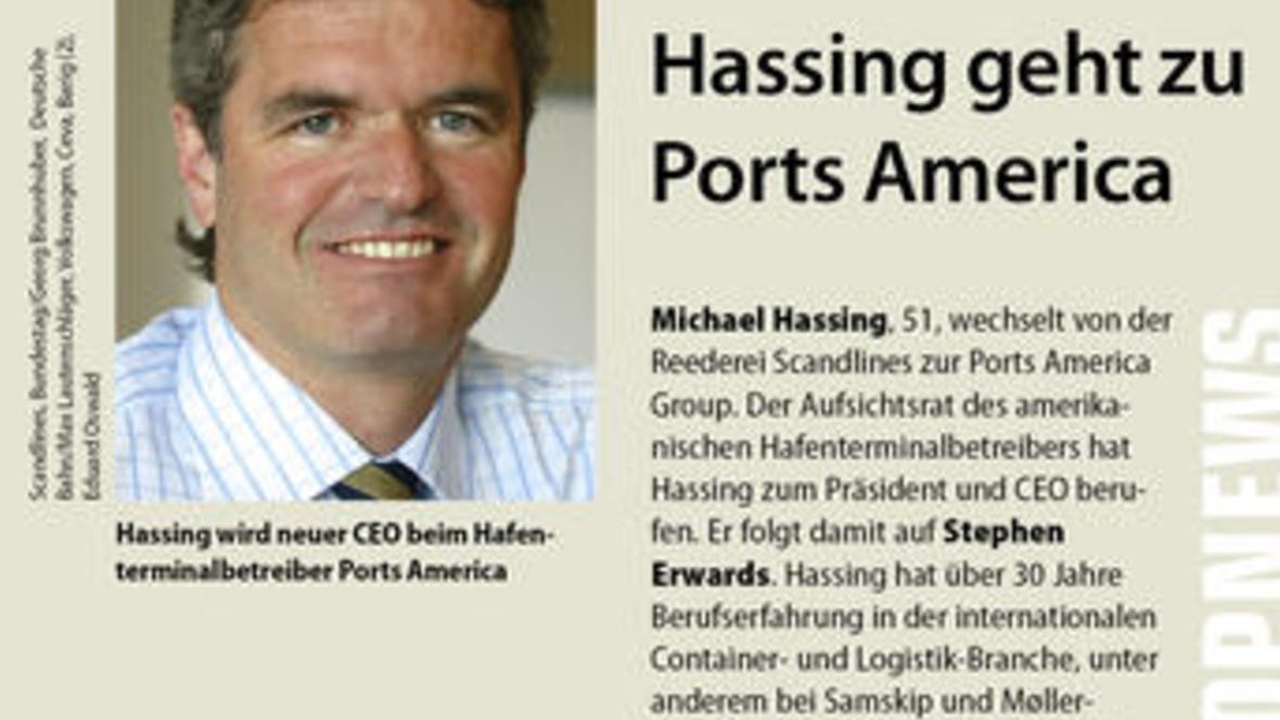Hassing geht zu Ports America Michael Hassing, 51, wechselt von der Reederei Scandlines zur Ports America Group. Der Aufsichtsrat des amerikanischen Hafenterminalbetreibers hat Hassing zum Präsident ...