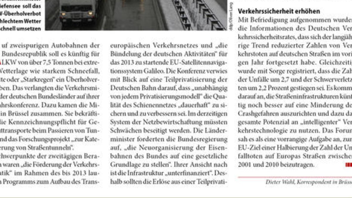 Zur halbjährlichen Verkehrsministerkonferenz kamen die Landes-minister nach Brüssel – besprochen wurden urdeutsche Themen Auf zweispurigen Autobahnen der Bundesrepublik soll es künftig für LKW von ü...