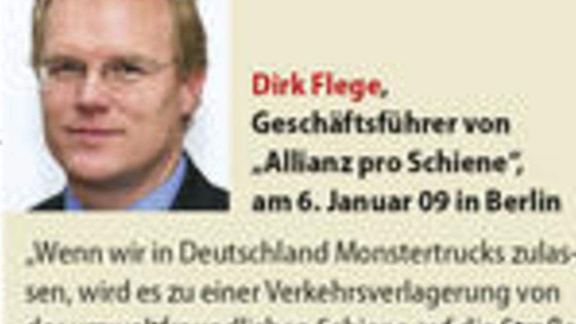 "Wenn wir in Deutschland Monstertrucks zulassen, wird es zu einer Verkehrsverlagerung von der umweltfreundlichen Schiene auf die Straße kommen." Dirk Flege, Geschäftsführer von "Allianz pro Schiene"...