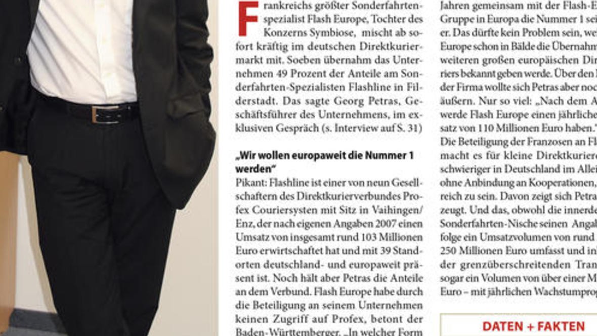 Binnen weniger Wochen hat sich der Wettbewerb im Direkt-kuriermarkt massiv verschärft. Jüngster Coup: Der französische Spezialist Flash Europe steigt mit 49 Prozent bei Profex-Partner Flashline ein. ...